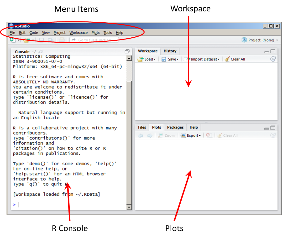 Open RStudio and a window like the one below should open. Across the top is a standard menu bar with typically menu items that we will look at in a little while. In the left-hand pane is a "console" window for R command. On the right is a "Workspace" panel that will show you the variables (also known as "objects") that you are working with in R. On the bottom right is a pane that will display plots you create.