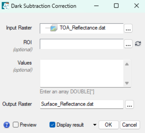 In the Dark Subtraction Correction tool window, select the file "TOA_Reflectance.dat" as the Input Raster.