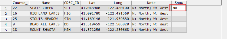 - Now you should see a column labeled "Snow". In this column we will add data indicating whether or not snow was measured at the location in the field. Visit https://cdec.water.ca.gov/reportapp/javareports?name=COURSES and search for the names of the five snow courses included in the shapefile (e.g. Slate Creek) and note whether or not snow was observed at the most recent measurement. A Depth value of "0" means no snow was present, any other number indicates some level of snow. Update the Snow attribute field by for each site by double-clicking in the field. Update to either "Yes" for snow or "No" for no snow measured. Click File > Save in the Attribute Viewer window when you are done.