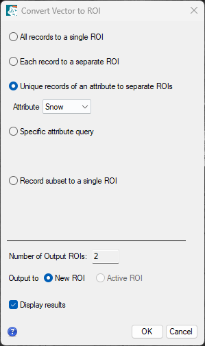 - In the Convert Vector to ROI window and select the "Unique records of an attribute to separate ROIs" and select Snow as the attribute and click OK. This will create two ROIs, one with sites that have snow and one with site without snow. Select the spectral layer as the Visualization Layer if given an option.