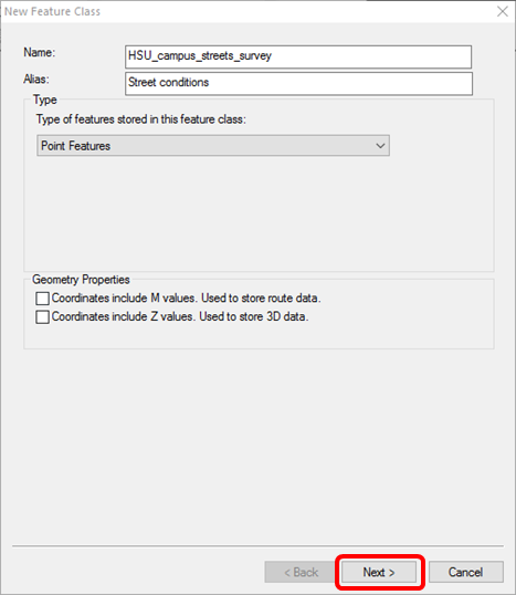 - Type HSU_campus_streets_survey as the name for the feature class, type Street conditions as the alias, and choose Point Features as the feature type. Click Next