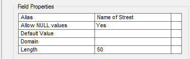 - Under Field Properties, click the field next to Alias, and change the default alias Name to Name of street. The alias is what your field-workers see on the data collection form, so it's important that it makes sense to them