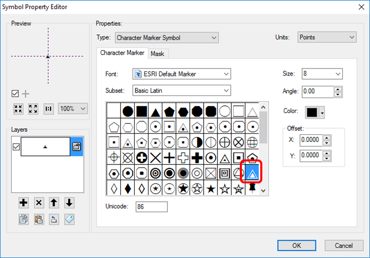 - Under Type, select Character Marker Symbol and choose the symbol shown below and click OK