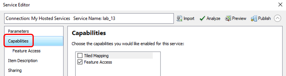- In the left pane in the Service Editor window, click Capabilities