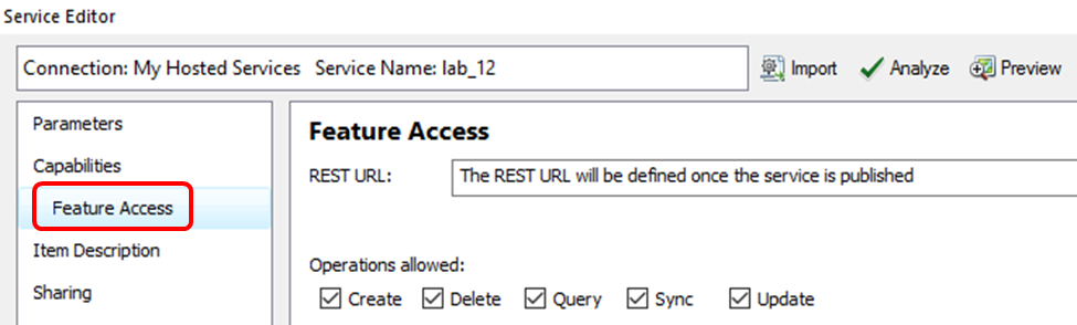 - These options specify what data collectors in the field can do with the data. For this lab, you need them to be able to add new damage incidences as well as edit and delete existing ones, so you enable options to create, update, and delete. Sync is enabled to allow you to take the map offline