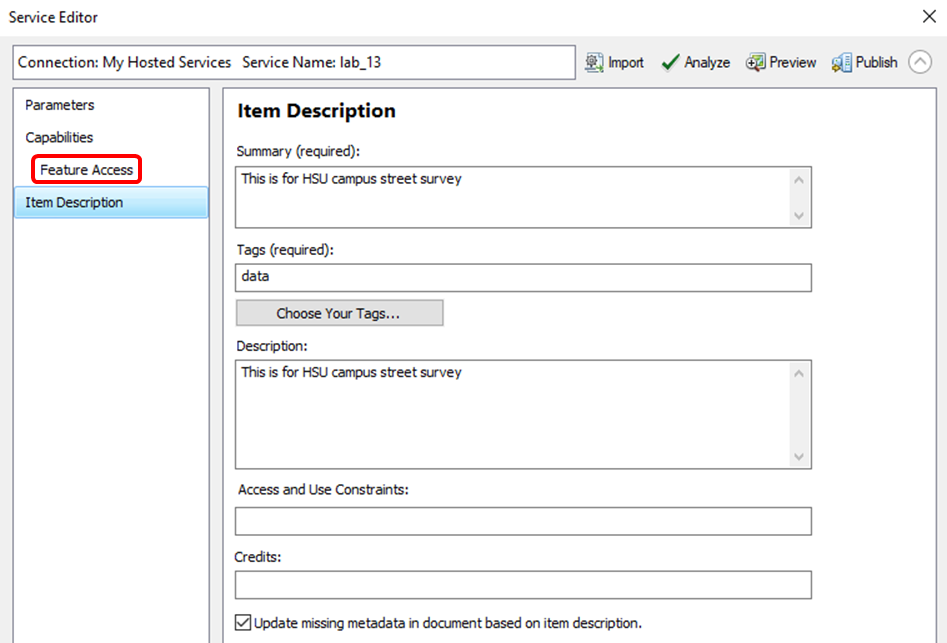 - In the left pane, click Item Description. Type data for the Tags (required) window and type the text for the Summary and Description as shown below: