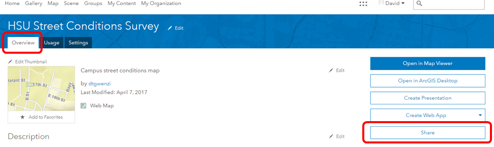 In this part of the lab, you will create a map to use to collect data about street conditions. You will build a map by starting with a basemap, adding the Street Conditions layer (that you published in part 1), configuring the data collection form, and customizing the application settings. Finally, you will share the map to make it available to anyone in your organization.