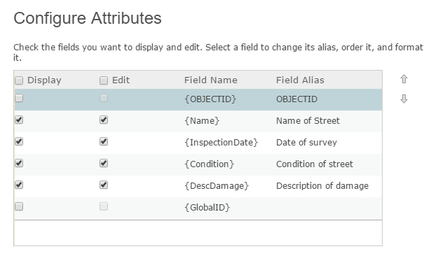 The Configure Attributes dialog box lists the features' fields by their display state (on or off), field name (which can't be changed), and field alias (which can be changed).