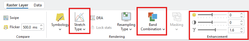 - Now we will make the final visual adjustments to the images. Click on one of the Landsat images in the Table of Contents. From the main toolbar you will see a Raster Layer tab, click on the tab. Here you can adjust the Contrast Stretch type, Brightness and other visual apperances of the raster. Use the tools to fine tune your images as you see fit (or leave as if the image look good already). You can adjust the settings to each layer seperately.