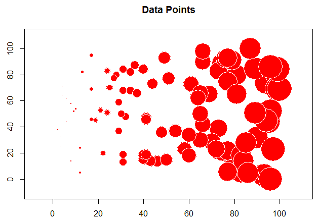 The problem with this is we want to see the values and where they are located. For this we will start using the "sp" library to first convert the "x" and "y" columns to coordinates and then create a bubble chart to plot the random values.